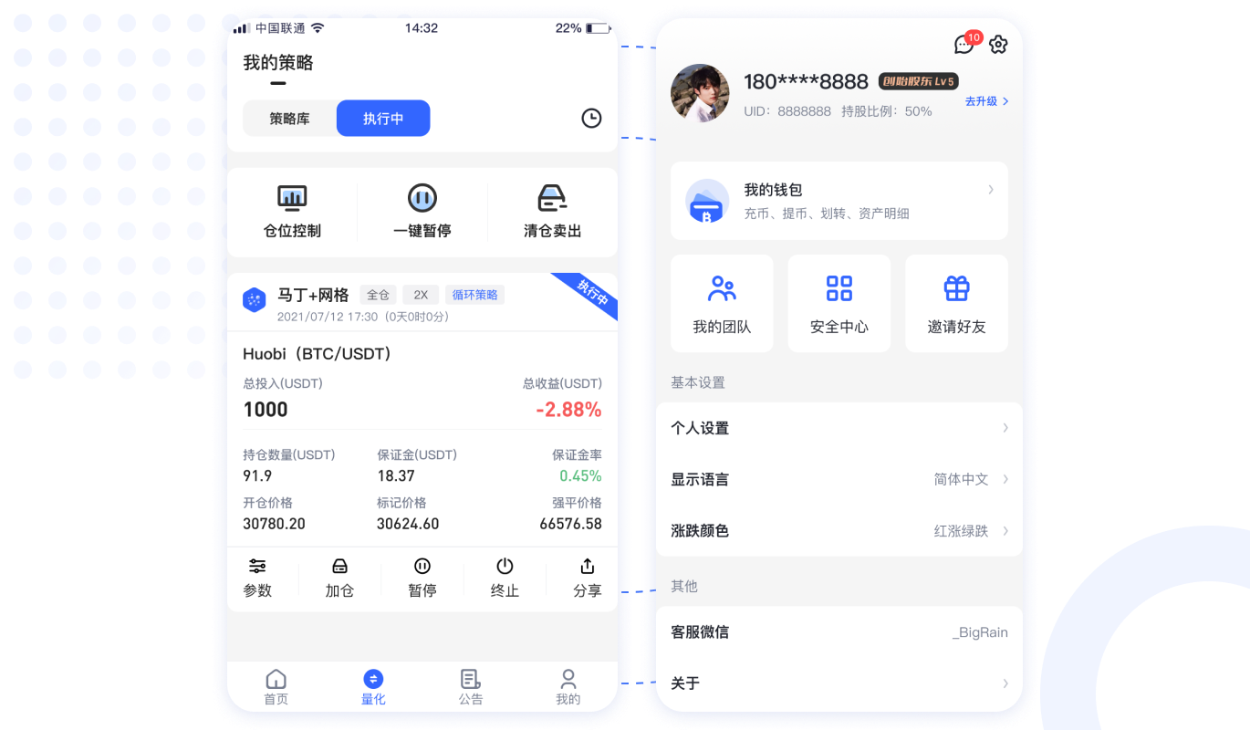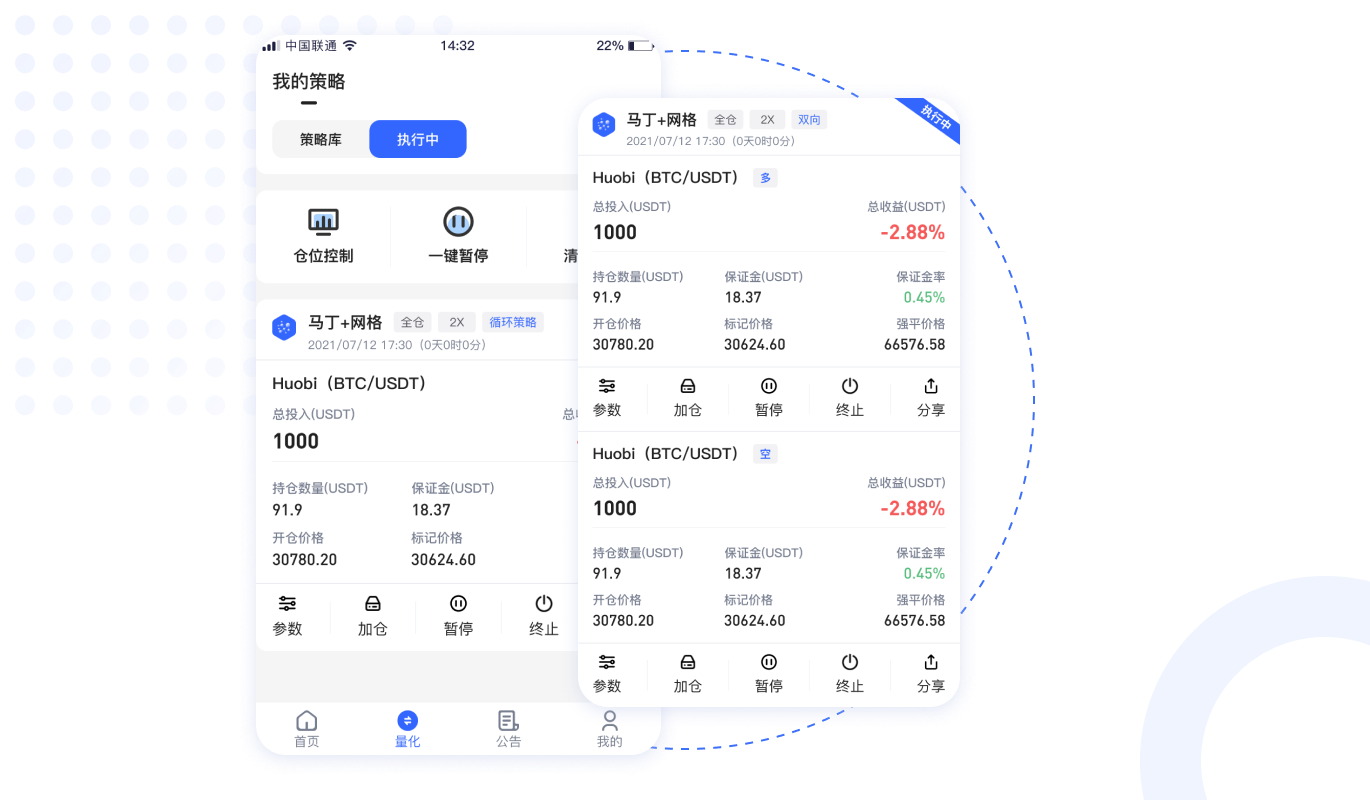 馬丁倍投+網(wǎng)格混合策略、趨勢(shì)補(bǔ)倉、尾單補(bǔ)倉、風(fēng)險(xiǎn)控制、防瀑布機(jī)制、螺旋式補(bǔ)倉、一鍵補(bǔ)倉,首單加倍。